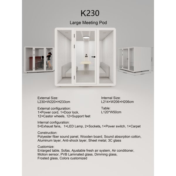 Ideal for offices, open-plan workspaces, educational institutions, and any environment requiring private meeting spaces for discussions, team collaborations, or group activities without disturbing surrounding areas.